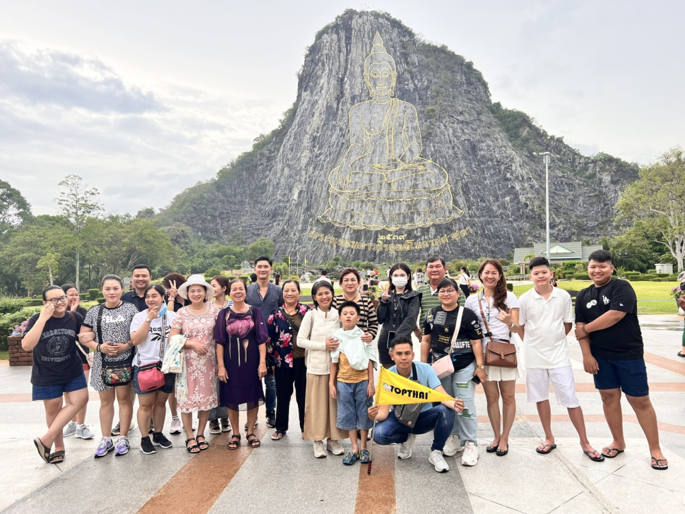 - Tiếp tục tham quan “Trân Bảo Phật Sơn” hay còn gọi là Khao Chee Chan, nơi được tạo nên kỷ niệm 50 năm đăng cơ của nhà vua Thái Lan. Là một ngọn núi đẹp nổi tiếng nằm ở tỉnh Chon Buri, cách Pattaya – thiên đường biển đảo Thái Lan chỉ khoảng 15 km, Nổi bật giữa thiên nhiên hùng vĩ và vẻ đẹp hoang sơ của thiên nhiên là bức tượng nổi Thích Ca Mâu Ni Phật đang ngồi tọa thiền được tạc trên vách núi cao, Bức tượng cao đến hơn 100 mét, rộng khoảng 70 mét, được đúc nổi hoàn toàn bằng vàng ròng 24 cara, được tiến hành xây dựng vào năm 1996 nhân dịp Quốc vương Rama IX trị vì vương quốc Thái Lan được 50 năm.